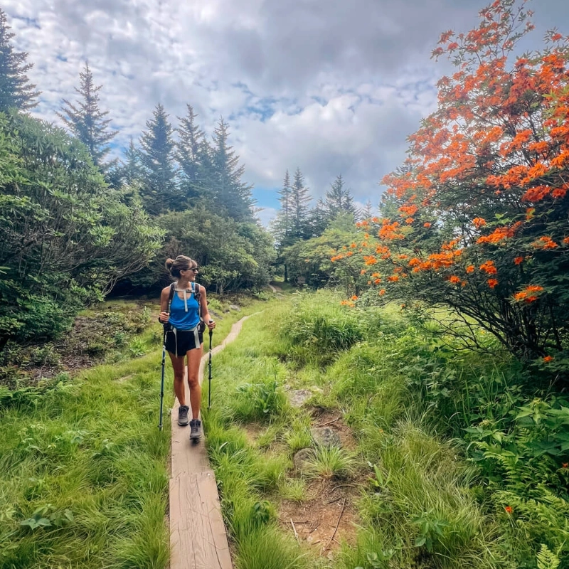 At an elevation of 5,920 feet, Andrew’s Bald offers sweeping vistas of the southern Smokies and Fontana Lake. During summer, the bald is famous for its vibrant flame azaleas and rhododendrons, painting the meadow with bursts of color. The trail itself winds through spruce-fir forest before opening up to the bald, making every step worth it.